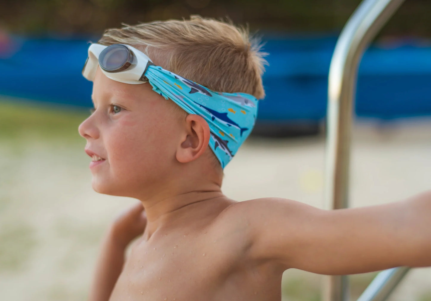Our Shark Attack swim goggle features our tangle-free, patent-pending strap in a shark print on a bubbly blue background. Paired with a white frame and lightly tinted grey lenses.