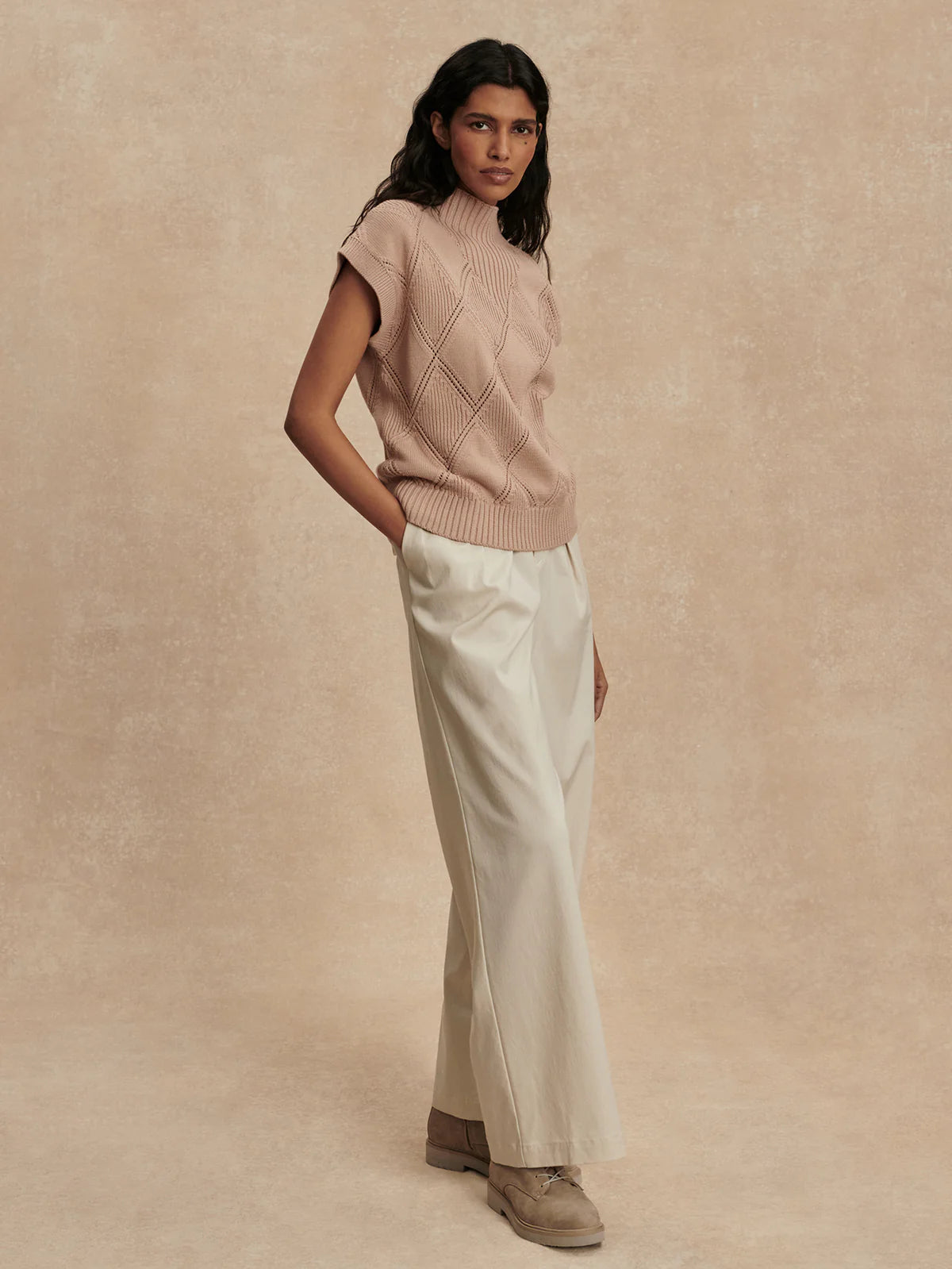 A relaxed top perfect for easy layering or wearing solo, the Keffin is crafted from 100% cotton in a mid-gauge knit. An all-over diamond pointelle stitch and rib detailing add texture, while the high neck and dropped sleeves create a contemporary shape.