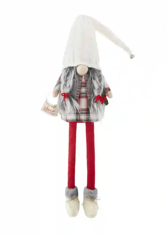 Christmas cheer starts with our Gnoel Christmas dangle leg gnome. The wool, felt and knit gnome features a weighted base and dangle legs. The gnome is wearing a large fuzzy red hat, white boots and plaid leggings. This gnome is holding a sign that reads "Gnoel". The gnome has a fuzzy gray beard.