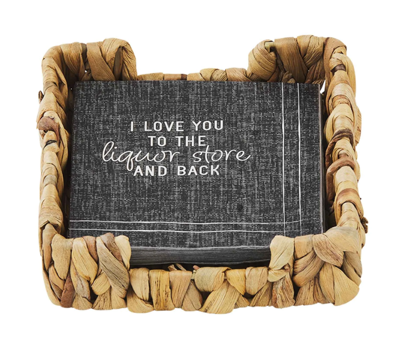 You'll love these Cocktail Napkin Set to the liquor store and back! The pack comes with 12 paper cocktail napkins. The napkins come in square water hyacinth basket. The cocktail napkins read "I love you to the liquor store and back", "When I said I was cleaning, I meant I was polishing off a bottle of wine", or "I'd say I'll drink to that but I'll drink to just about anything."
