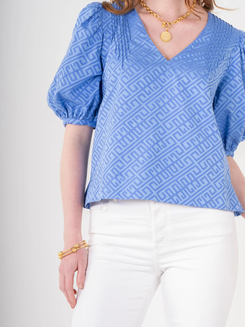 Elevate your everyday style with the Penny Top in Blueberry Monogram. This piece features a flattering v-neckline accented with delicate pintuck detailing, adding a touch of refined elevation. The subtle puff sleeves provide a feminine touch, while the slightly tailored silhouette ensures a polished and comfortable fit. The Blueberry Monogram jacquard print showcases a chic two-toned array of our signature monogram logo, creating a modern and timeless look. Perfect for dressing up or down, this top is a versatile addition to your wardrobe.