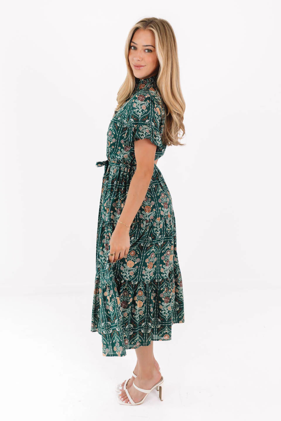 This charming hunter midi dress showcases a moody print and a flattering adjustable tie waist for a timeless, feminine look. The button-up neckline and short sleeves add a classic touch, making it effortlessly polished. With its warm tones and easy silhouette, it’s the perfect piece for fall outings or brunch dates.