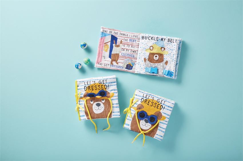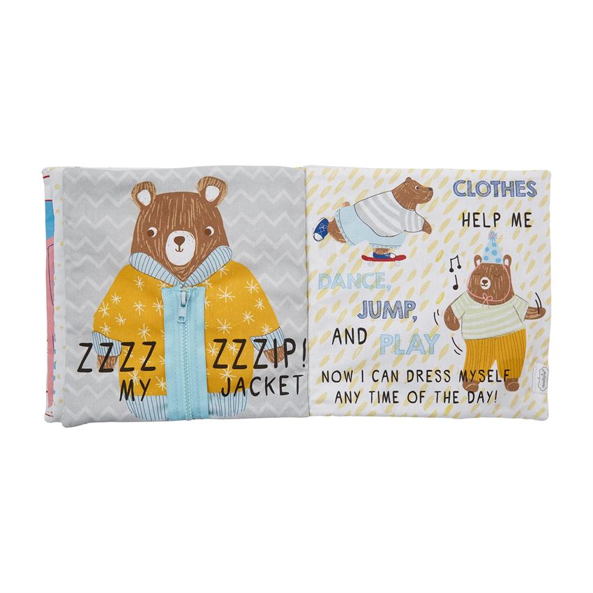 Soft printed baby safe book with sensory crinkle paper features a sweet illustrated story about learning how to get dressed with zipping, buckling and other interactive activities.