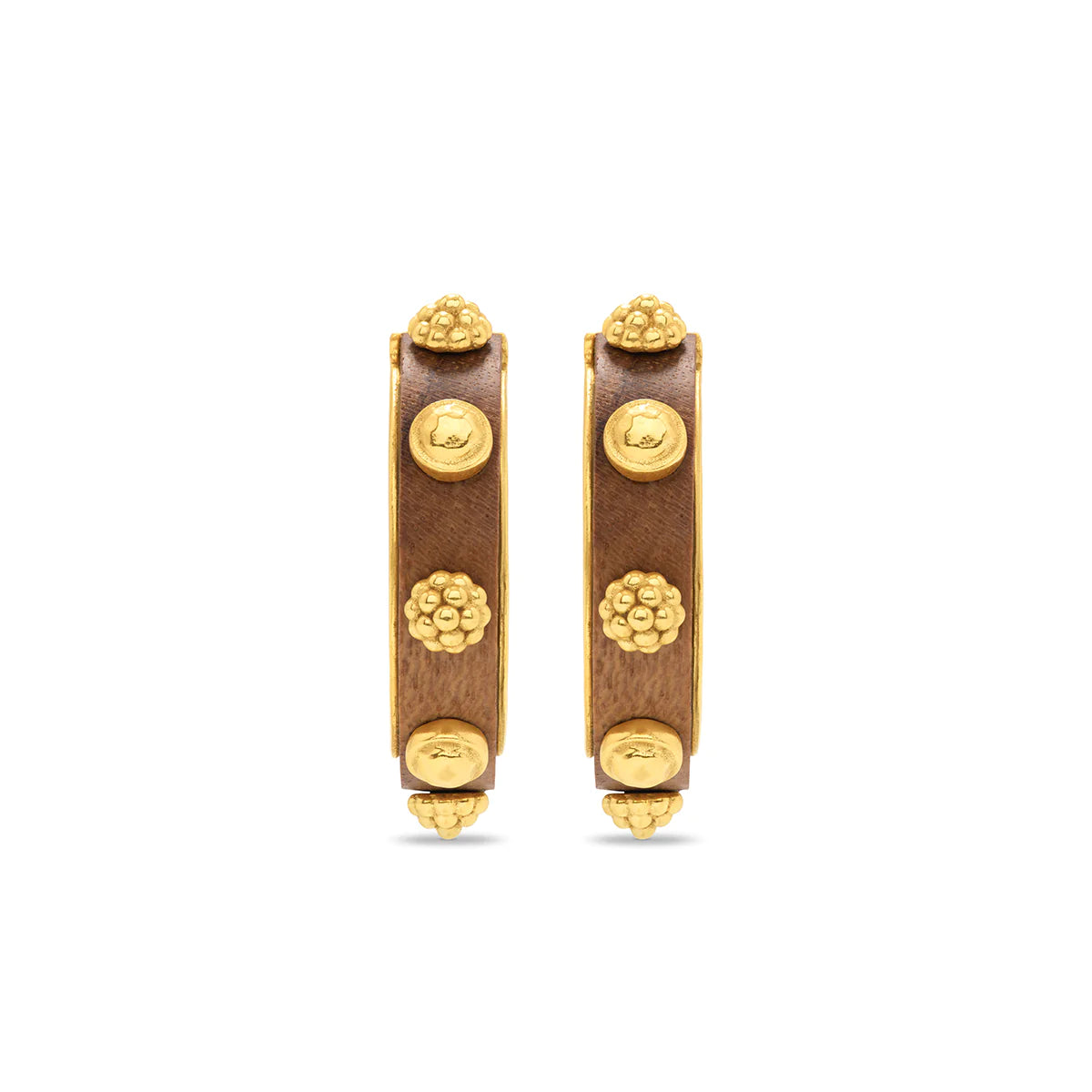The Greek goddess personifying Earth, Gaia is strong, protective and nurturing. These hand- carved teak wood earrings are accented with gleaming gold and are a natural neutral that transitions beautifully from casual to formal and day to night.