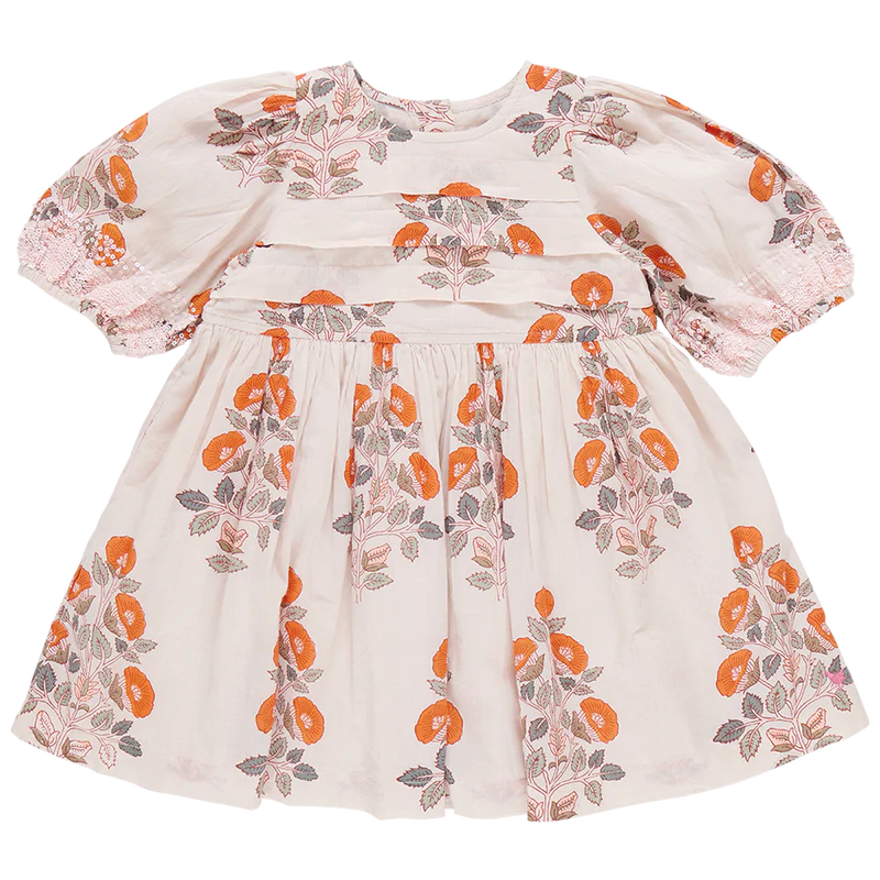 Vintage Vibes! Our classic Cloud Bouquet Floral Block Print, highlighted by warm orange hued blossoms against a pale pink ground, gives our Girls Evelyn Dress a stylish yet nostalgic appeal. This easy to wear piece features a pleated chest and gathered puff short sleeves. A signature glitter button at the back rounds out the autumnal look. Perfect for a Fall family brunch or an afternoon playdate with friends.