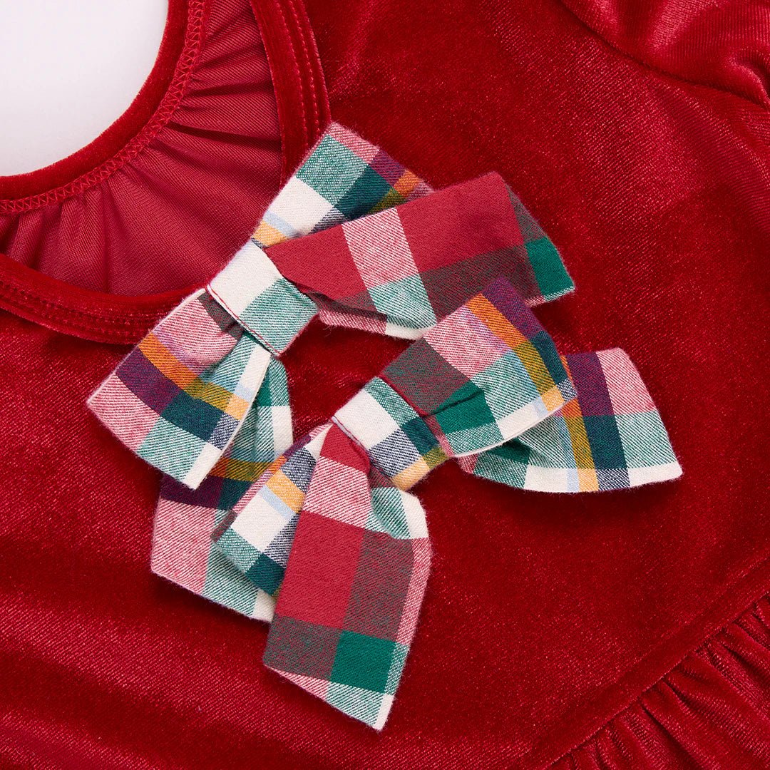 Christmas Chic! Our classic Girls Pearl Dress makes a stylish holiday statement fashioned in a rich Red Velour. The three tiered, long sleeve crewneck silhouette dips lower in the back highlighting two festive tartan bows. Match back to Little Sister in our Baby Girls Jennifer Jumper in Red Velour.