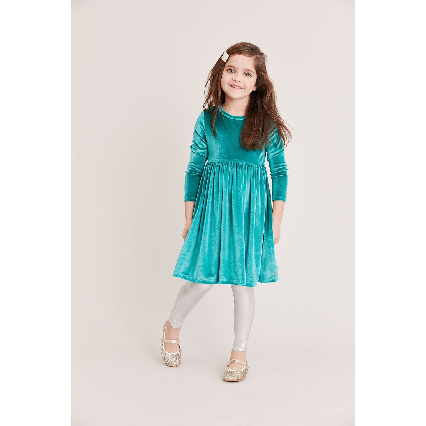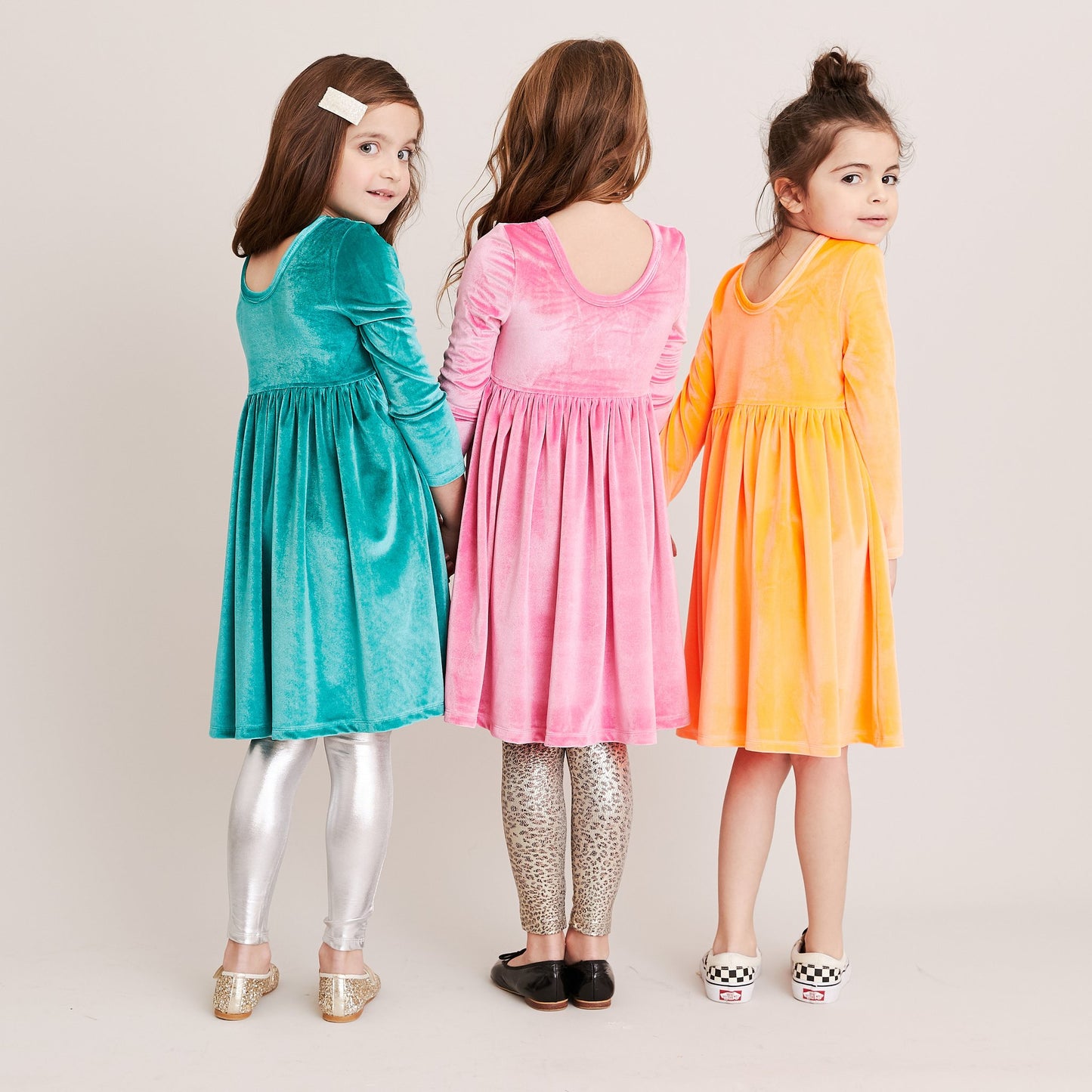 Our not-so-basic Steph Dress is the perfect everyday dress, and now in an array of sherbet colors, you can highlight your day with a little extra color! Polyester and spandex blend to make the softest velour in sweet pink, turquoise, and neon orange. We love this look with lamé leggings and sneakers for everyday or flats to dress it up. Match with a baby chick’s velour Quinn bubble, too!