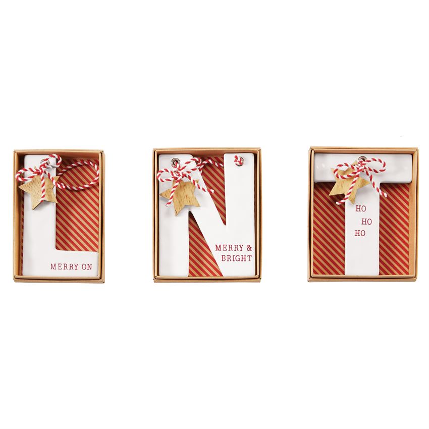 Ceramic letter ornament features debossed sentiment, wooden accent detail and twisted red and white cord loop.