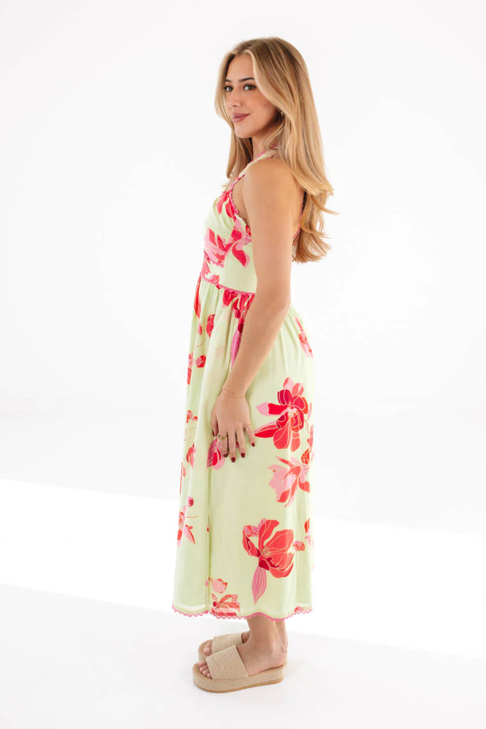 This charming green midi dress features a soft pink floral print, bringing a fresh and feminine feel to your wardrobe. With ric rac detail adding a playful touch, front cross straps create a flattering sun-kissed look, while the back zipper ensures a sleek fit. Perfect for a spring outing or special occasion, this dress combines style and comfort effortlessly.