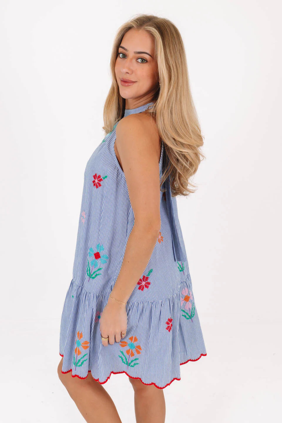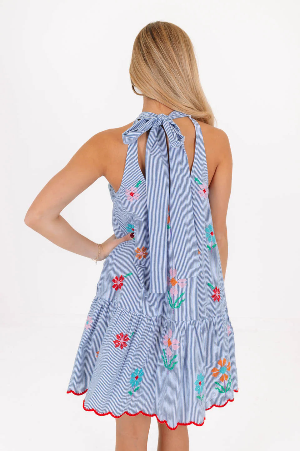 Fresh and breezy, this blue & white stripe A-line dress is a spring dream with its high neckline, open tie-back, and delicate embroidery. The flowy silhouette and playful details make it perfect for sunny days and warm breezes!