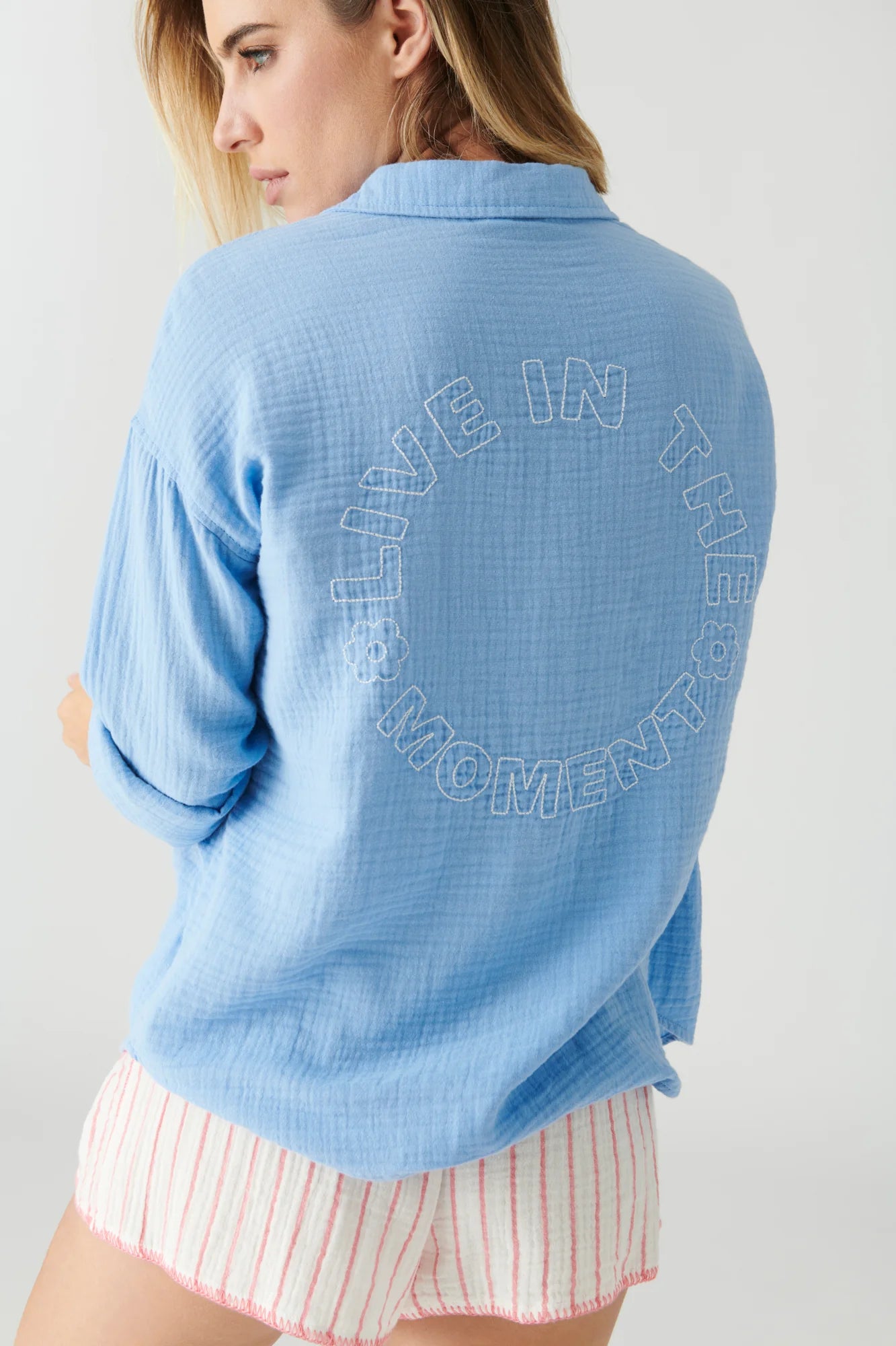 Stay comfortable and stylish in this lightweight and breathable 100% cotton gauze summer long-sleeve top and short set. The top features contrast stitching on the front pocket and embroidery on the back stating, "Live In The Moment."
