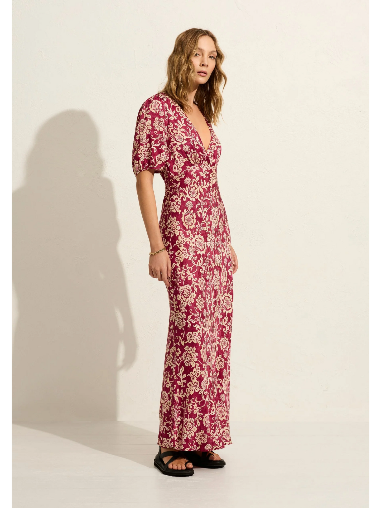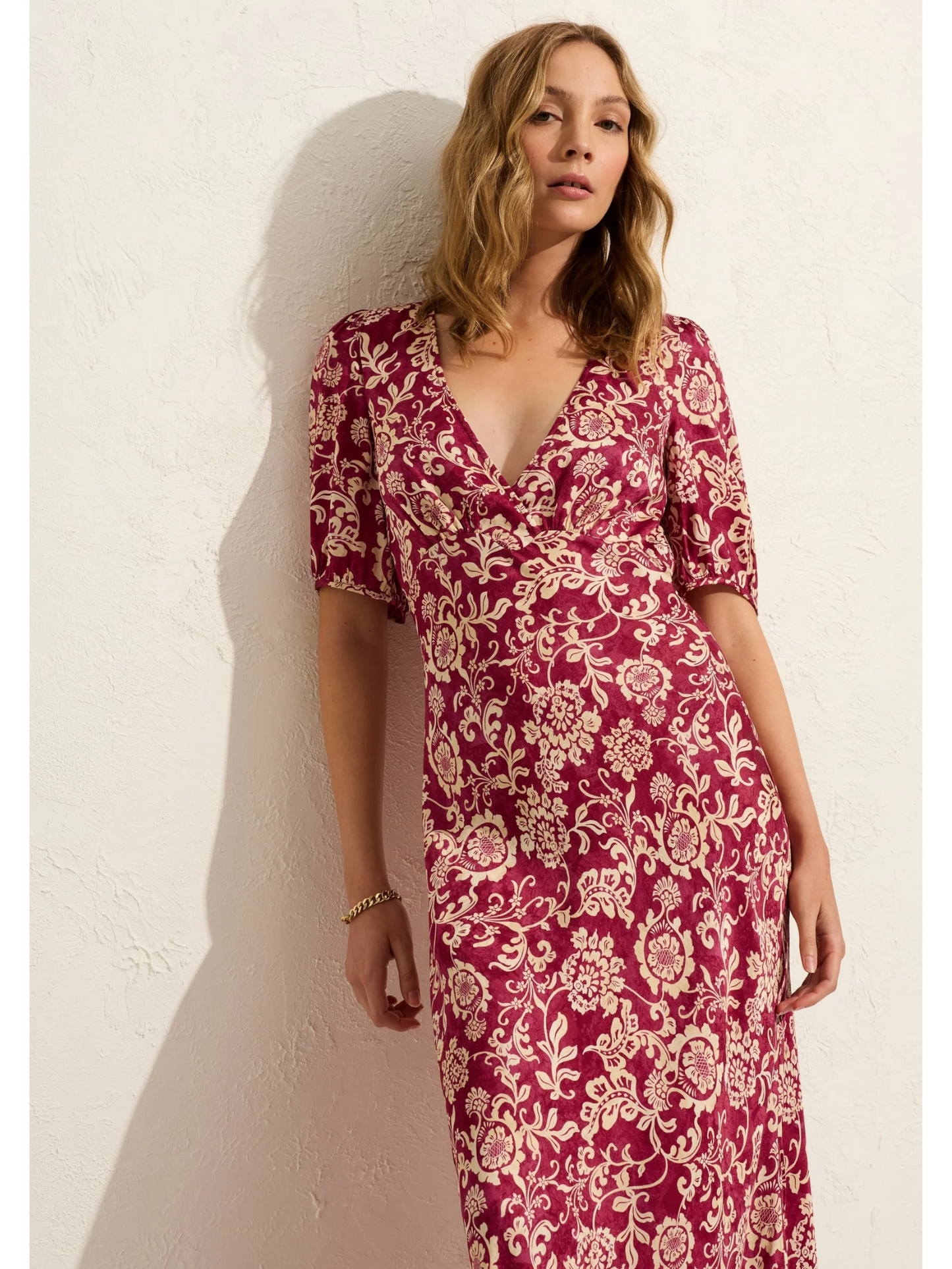 The Pamela Midi Dress in our new Clover Print features a flattering crossover V neckline and charming short puff sleeves. The shaped underbust seam with soft gathers accentuates the bust, while the flattering bias-cut silhouette gracefully falls to a draped hem.
