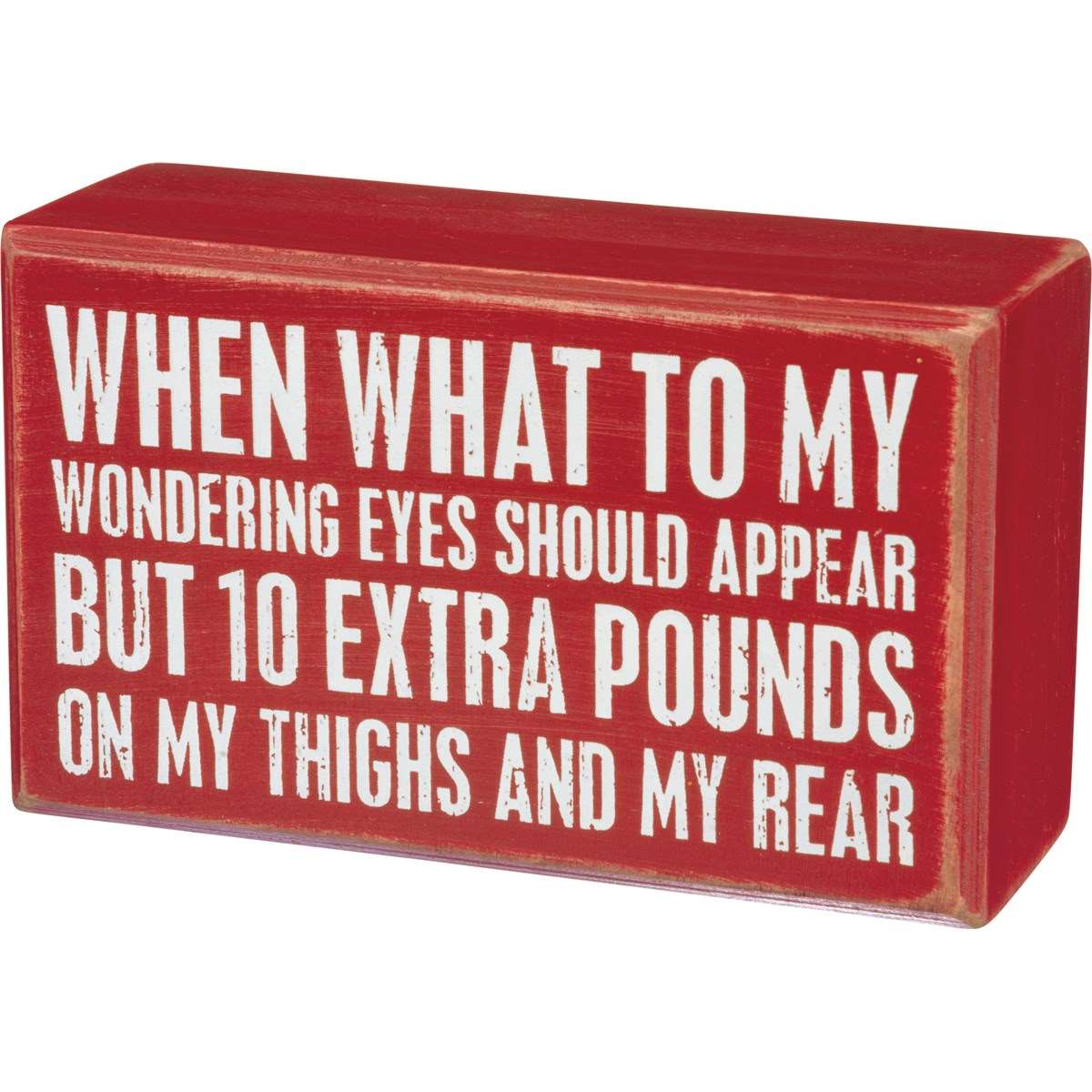 A red and white wooden box sign featuring a distressed "When What To My Wondering Eyes Should Appear But 10 Extra Pounds On My Thighs And My Rear" sentiment. Easy to hang or can free-stand alone.