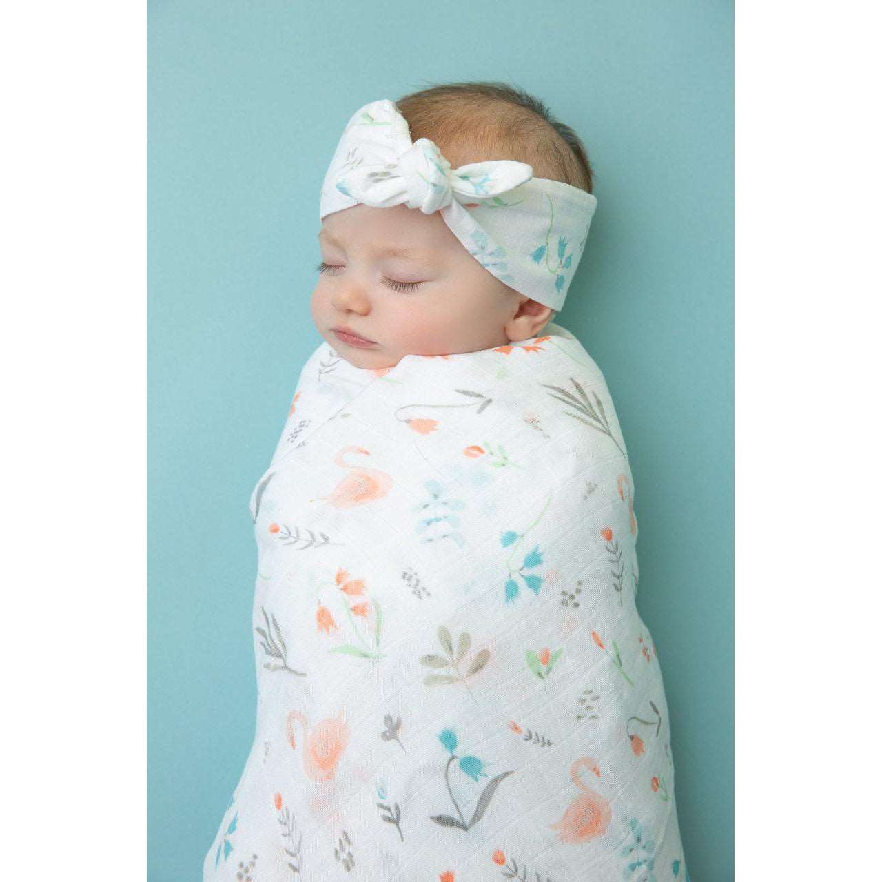 Snuggle, Swaddle, Sleep, Repeat. Our soft and adorable print swaddles are sure to delight everyone! Versatile design that's great for swaddling, nursing, cuddling and so much more. Pair with our Swan Floral Muslin Kimono Dress & Bloomer for the perfect gift!