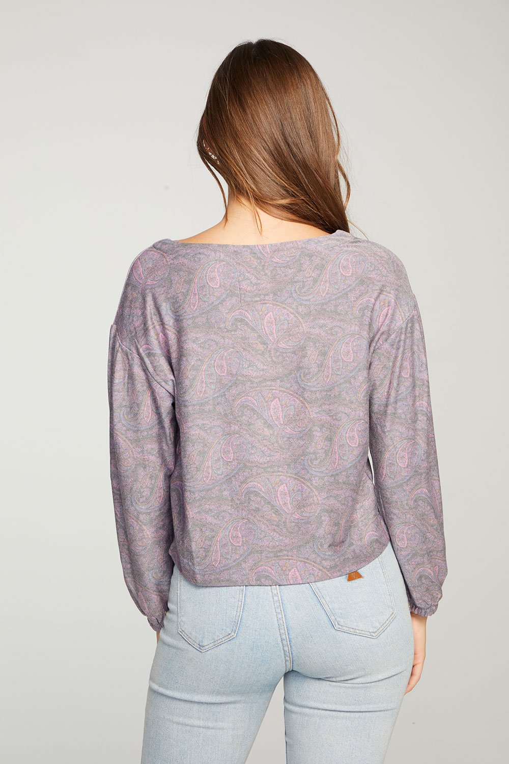 Chaser Cozy Knit Blouson Sleeve Crop Pullover Paisley