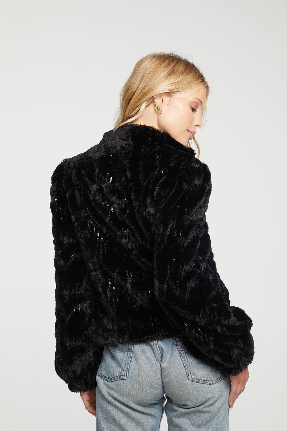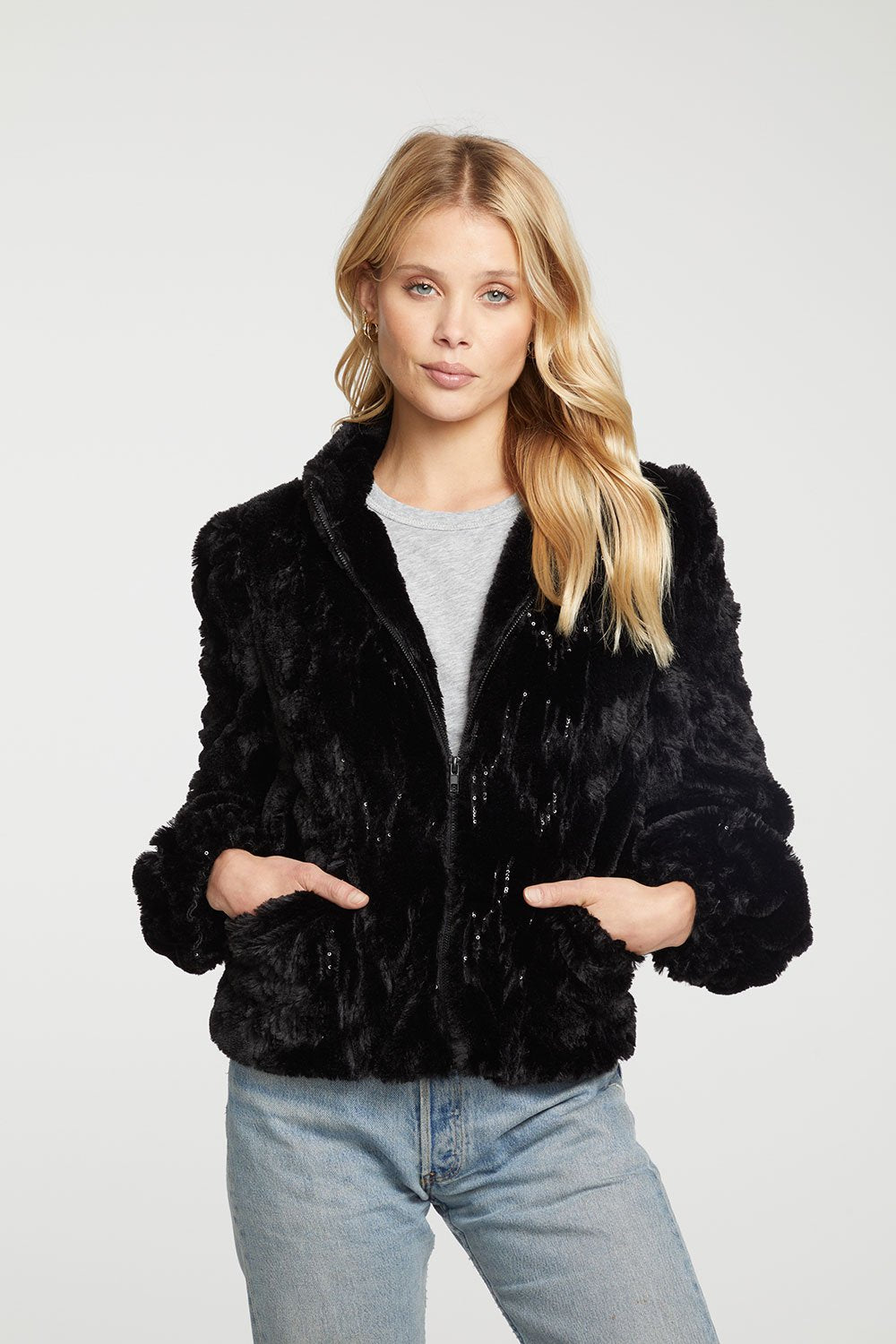 Chaser Sequin Faux Fur Puff Sleeve Zip up Jacket