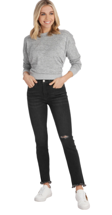Refresh your wardrobe for the season with our Hyde black straight leg jeans. The cotton spandex straight leg denim features slight distressing on the knee. The jeans have high-rise waist and a raw edge high-low hem. These jeans feature a slight crop, curved front hem. The jeans inseam measures approximately 28" on size small.