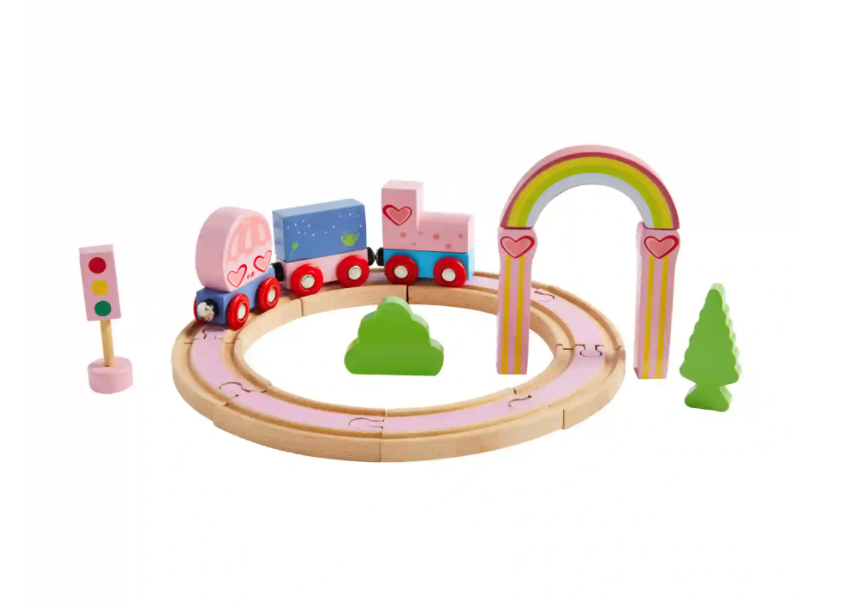 Regular price $16.99This wood rainbow train set is so precious! The 17-piece set comes with a boxed wooden train set. The set comes with an easily assembled track. The set also includes train cars that have magnetic connectors. The set comes with train accessories including trees, traffic lights and an arch. This set is intended for ages 3 and up.
