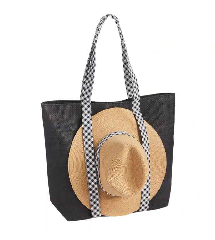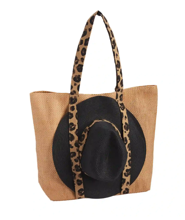 You'll have everything you need to be out of office with our Tan Tote Bag and Sun Hat Set. The two piece set comes with a paper straw tote that features patterned canvas handles. The tote bag has an interior pocket and magnetic snap closure. The bag holds an included paper straw hat with a coordinating canvas band.