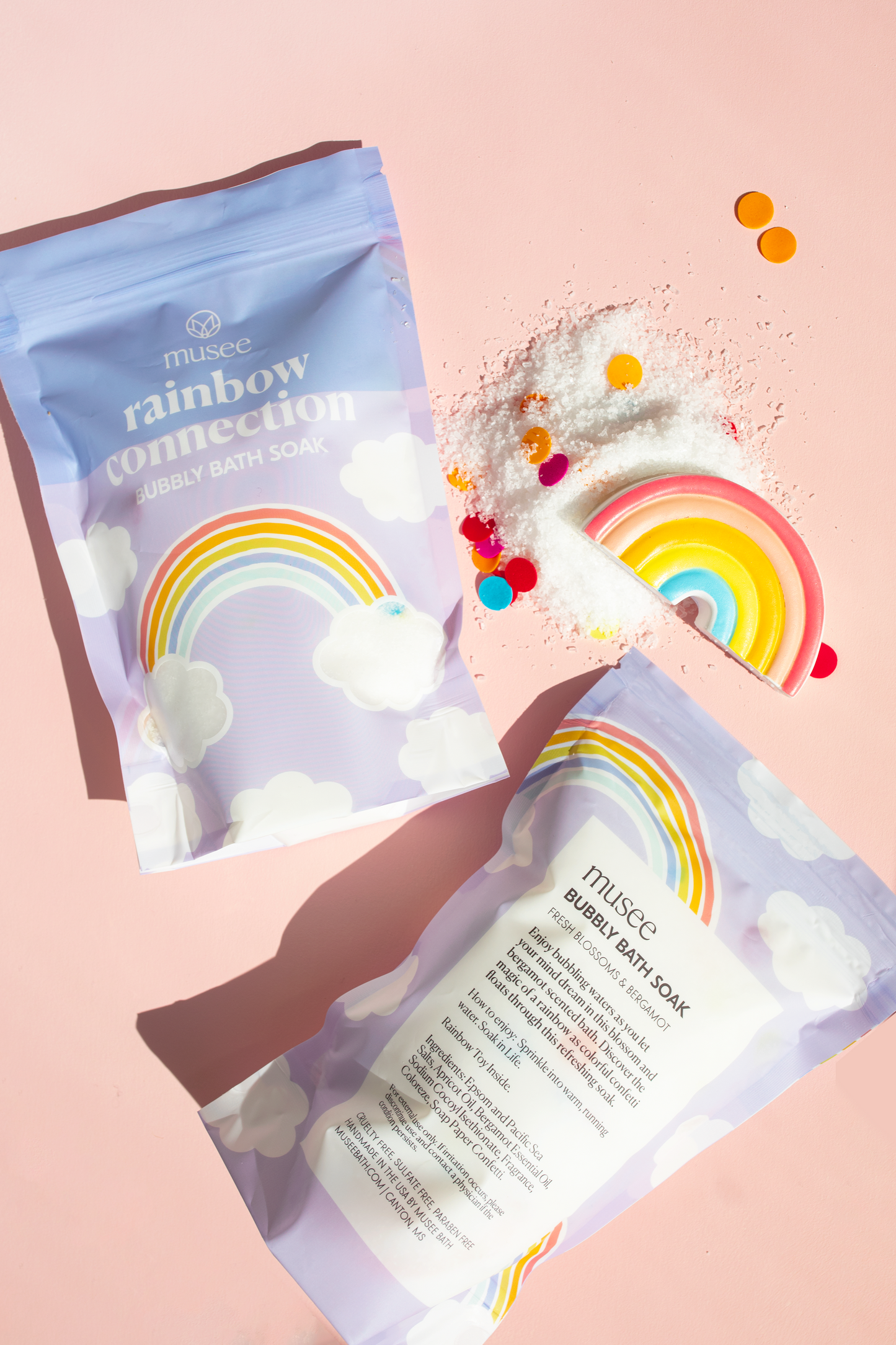 Enjoy bubbly waters as you let your mind dream in this blossom and bergamot scented bath. Discover the magic of a rainbow as colorful confetti floats through this refreshing soak!