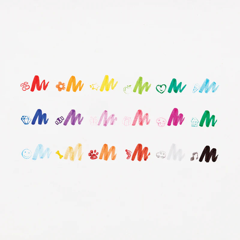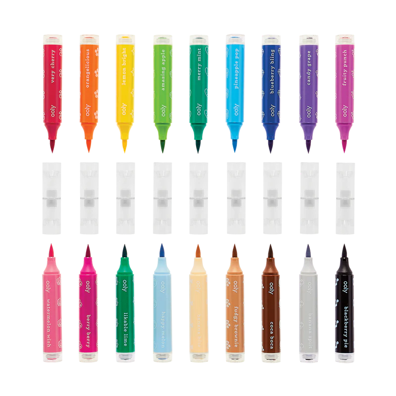- Set of 18 markers with a brush tip on one end and a stamp on the other