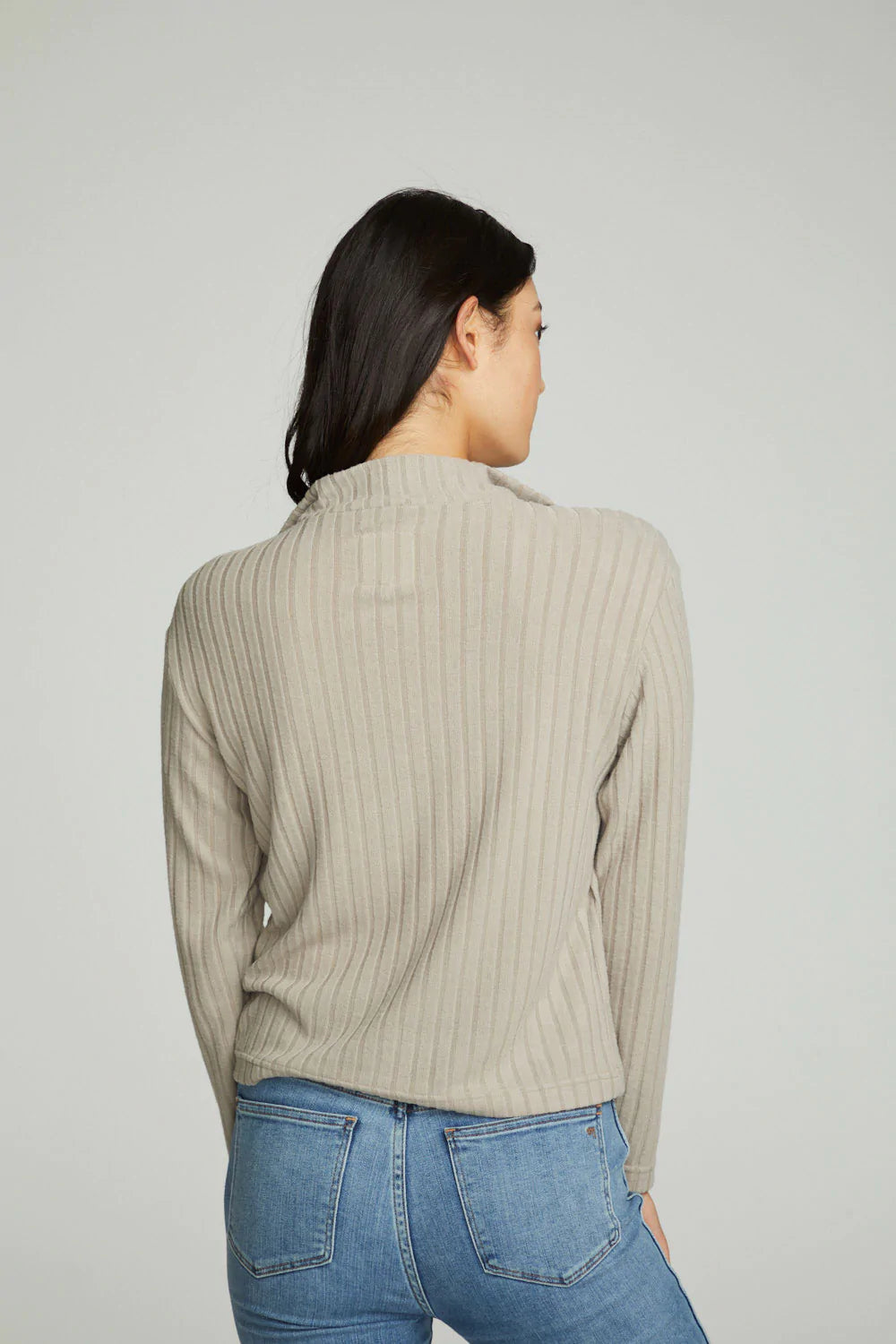 Our Zip Up Mock Neck Long Sleeve Pullover features poor boy rib fabric and a relaxed fit.